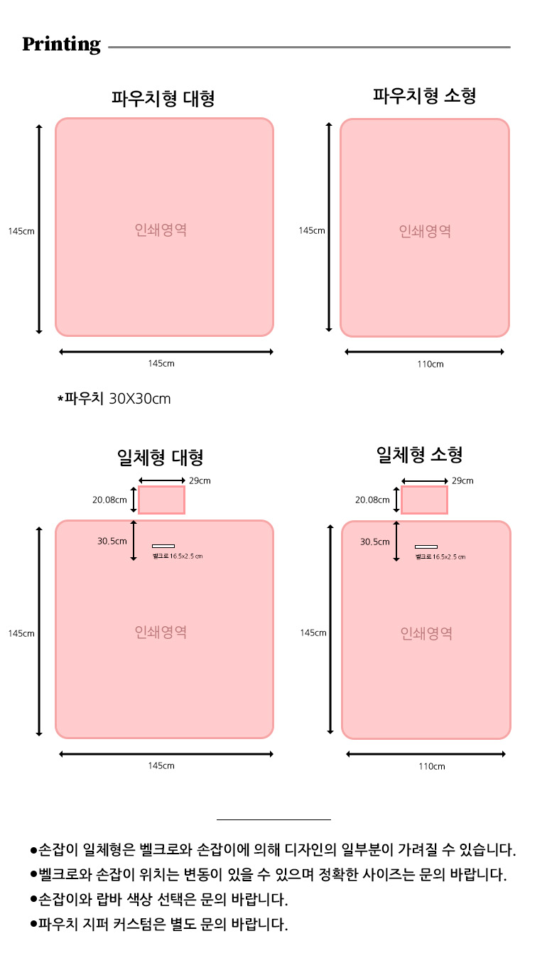 상품별로 제작 기간,최소주문량,제품 크기와 인쇄 영역이 다릅니다.